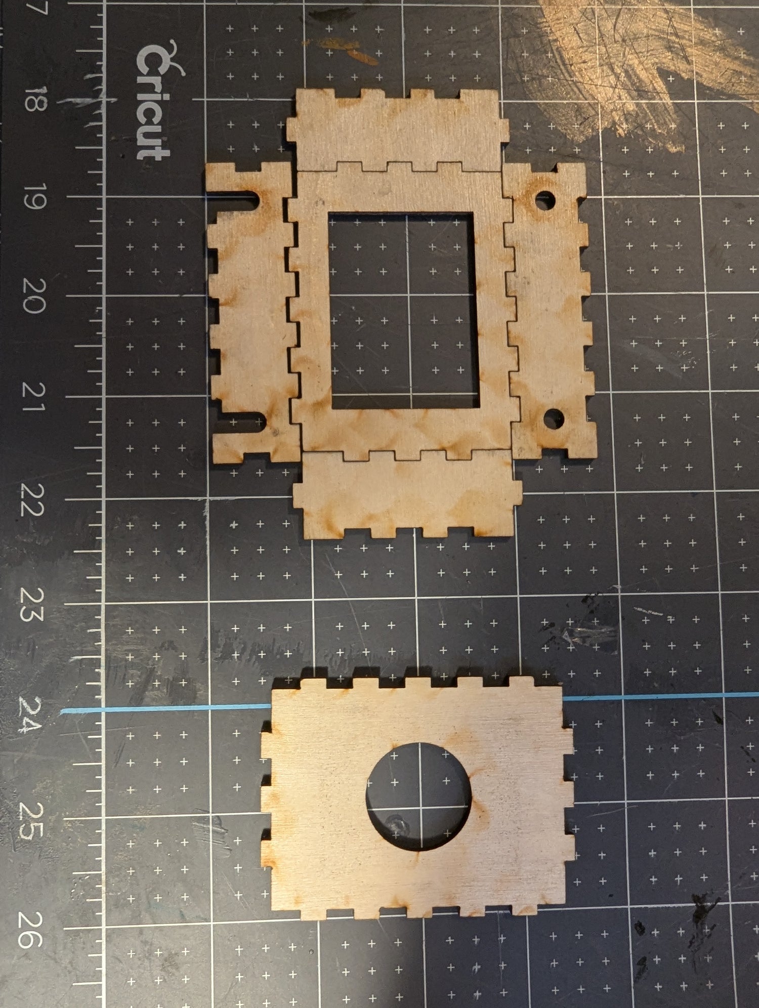 Put the square face piece, face down. Line up the edges. You will see two long sides, one with holes and the other with notches. The open sides of the notches face away from the square face piece.
